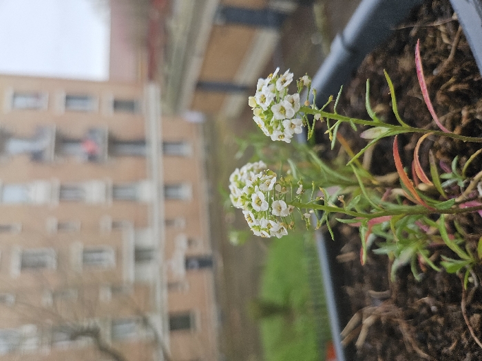 The image presents a close-up, elevated view of an urban scene in Villeneuve-Saint-Georges, France. In the immediate foreground, a black rectangular planter contains dark brown soil from which several small plants are growing. Two prominent plants, identified as *Lobularia maritima* (Sweet Alyssum), are in sharp focus, each displaying clusters of numerous small white flowers with yellow centers atop slender green stems. Some lower leaves on these plants exhibit reddish-brown discoloration. Beyond the planter, the midground is out of focus, revealing a green grassy area and, to the right, a low-lying structure with a flat, dark roof, possibly concrete. The background is dominated by a multi-story residential building featuring a light brown or beige facade, multiple rectangular windows, and several balconies with vertical railings. A reddish item of fabric or clothing is visible hanging over a railing on one of the upper-floor balconies. A deciduous tree with bare branches stands partially visible on the left side, obscuring a portion of the building. The sky is uniformly overcast, indicating a dull or cloudy day. No human subjects are discernible within the frame.