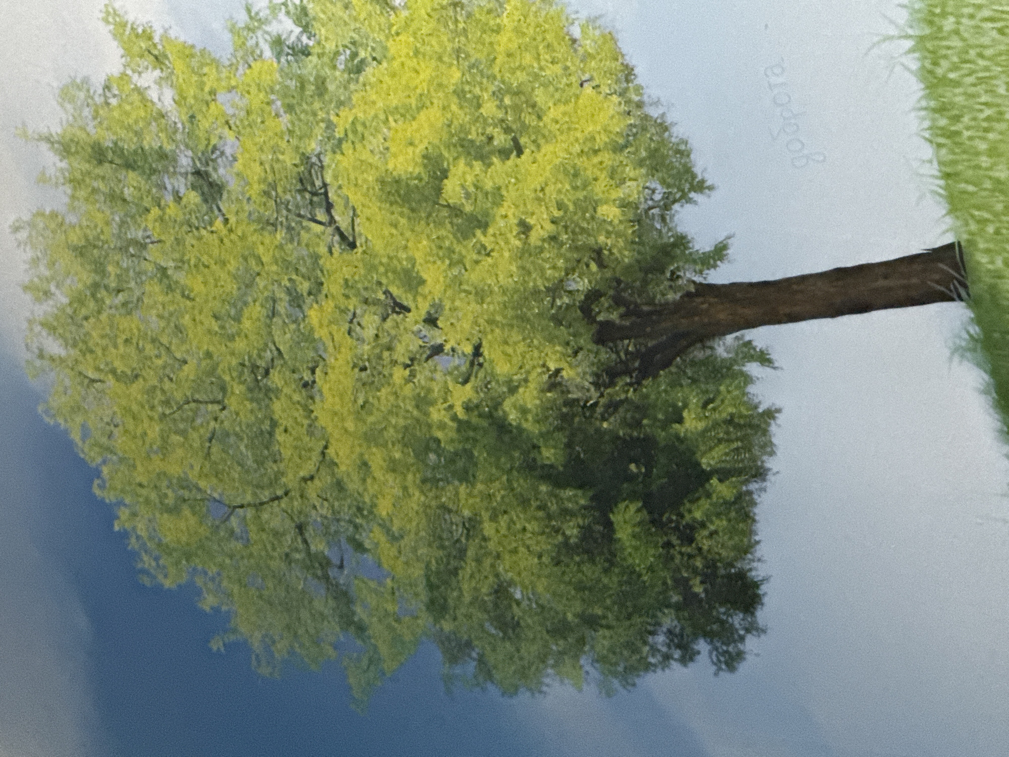 The image depicts a tree with lush green foliage in front of a background of blue sky and white clouds. The tree has a thick brown trunk and branches. To the right of the tree is a patch of green grass. Text, possibly Cyrillic, is visible next to the grass. The image appears to be rotated counter-clockwise. The location is purported to be Peshtera, Bulgaria.
