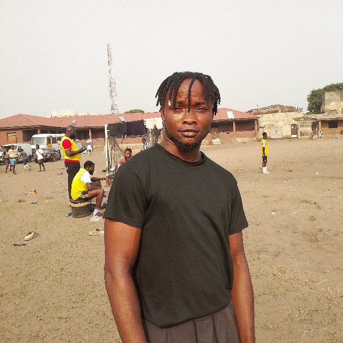 The image depicts an outdoor scene on a dry, light-brown dirt field under an overcast sky, located in the city of Unknown, Unknown. In the foreground, an adult male with dark skin, wearing a black short-sleeved t-shirt and dark athletic shorts, stands facing the camera with a neutral expression. He has short, dark dreadlocks and a light beard; his skin appears glistening. In the mid-ground to the left, a group of individuals is gathered. A man in a yellow and black striped t-shirt stands, holding a tablet or similar device. Another man in a yellow t-shirt sits on a dark tire. Several other people are visible standing or moving behind them. A white minibus and at least two cars are parked in this area. Behind the vehicles, multiple low-rise buildings with reddish-brown tiled roofs are present. A tall, lattice-structured metal communications tower rises prominently in the far left background. To the right, the open dirt field extends. A lone individual wearing a yellow t-shirt and white shorts stands in the mid-ground, facing right. In the far right background, a light-colored, possibly dilapidated building with a flat roof is visible. The ground throughout the scene is uneven and sparsely covered with dry vegetation and scattered debris, including a pair of light-colored shoes in the lower-left foreground.