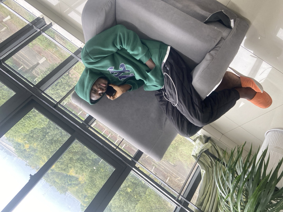 The image displays a male individual seated on a gray upholstered sofa inside a structure located in Jiangjin, China