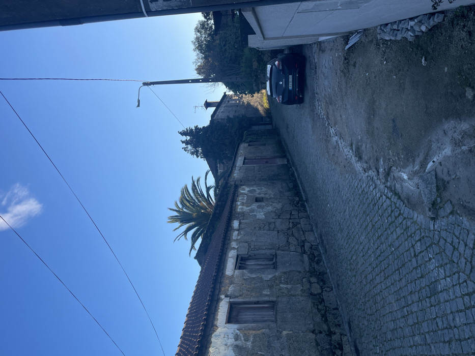 A vertical view captures a narrow street with aged stone buildings on the left and a mix of dirt and stone on the right. A black car is parked near a green area. A palm tree extends above the roof of the stone building. Overhead, a blue sky is crossed by power lines and a street light pole. The buildings exhibit worn facades with boarded-up windows.