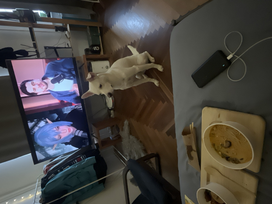 This image, captured in Saint Petersburg, Russia, depicts an indoor domestic setting. A white, medium-sized dog with erect ears is seated on a herringbone parquet floor, looking intently towards the right of the frame. In the background, a large flat-screen television is centrally positioned on a wooden stand, displaying a video featuring two individuals. The left side of the screen shows a person with light blue hair and pointed ears, wearing dark attire. The right side shows a male with dark hair and a beard, wearing a blue jacket over a white shirt, speaking into a microphone. In the foreground, on a dark grey bed or sofa, two white bowls of food are presented on light wooden serving boards. One bowl contains a noodle dish with mushrooms in a light orange broth. The second bowl contains darker, solid food items. A wooden spoon rests between the bowls. A brown paper bag containing chopsticks is also present, showing a dark stain. A black power bank with an illuminated green indicator light lies on the bed/sofa, connected by a white charging cable formed into a figure-eight shape. To the left of the scene, a dark blue armchair with wooden frames and a metal clothes rack with hanging garments are partially visible. On the right, behind the dog, a multi-tiered wooden shelf unit displays various objects, including a black KAWS Companion figure. String lights are visible on a wall fixture on the left. The room is illuminated by artificial indoor lighting. No human subjects are physically present in the depicted scene.