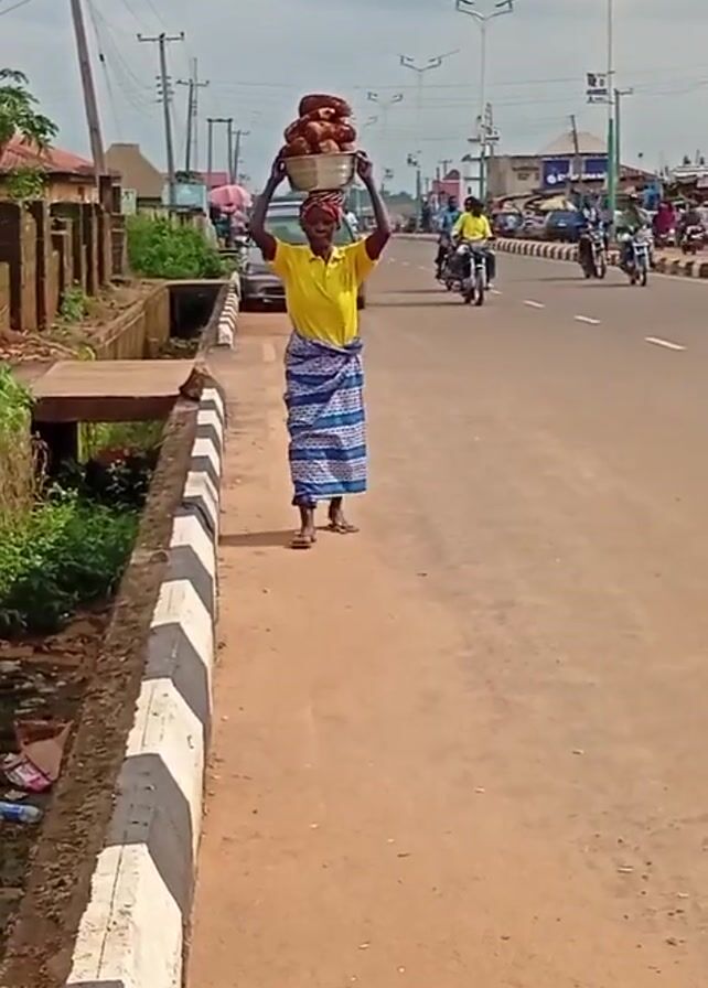 woman carrying a container of baked goods on her head while walking down a sidewalk next to a road