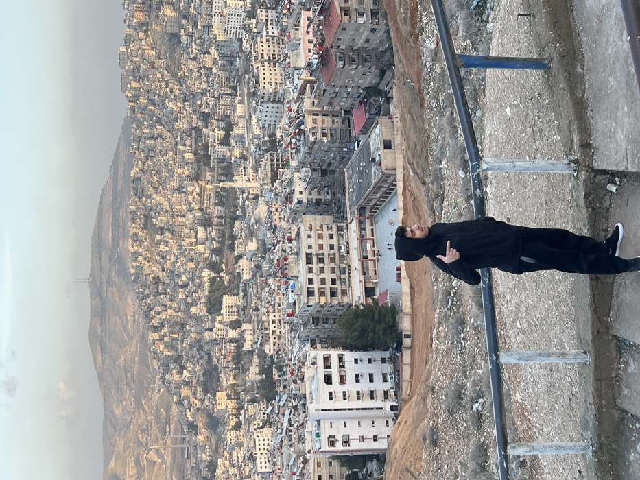 The image displays an expansive urban landscape identified as the city of Qudsaiya, Syria, observed from an elevated, barren hillside