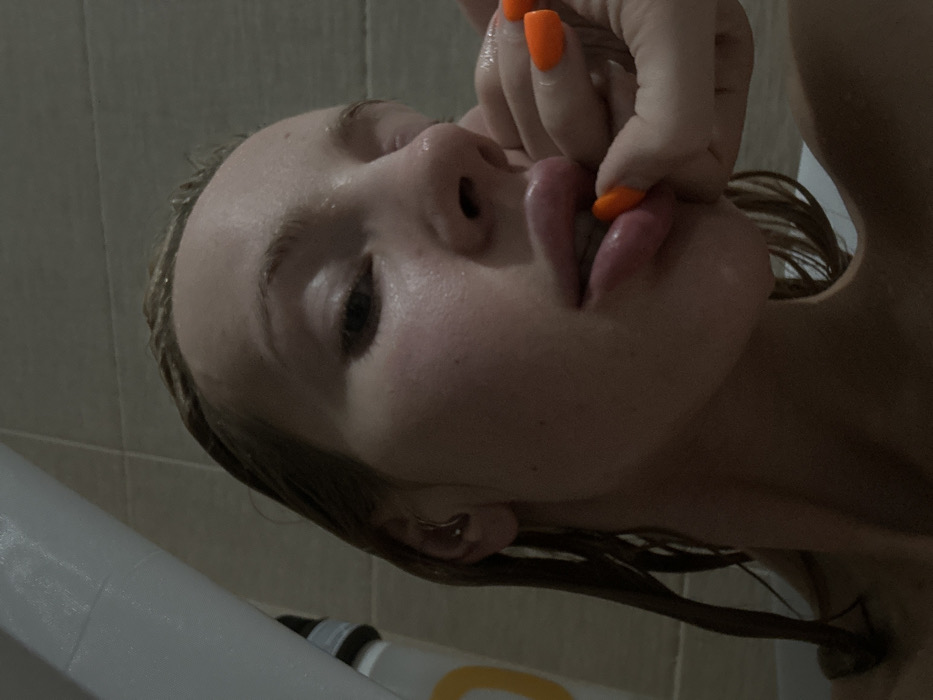 The image depicts a female individual in a bathroom setting, located in Novoe Devyatkino, Russia. The subject is shown from the upper chest upwards, with wet light-colored hair and moist skin, suggesting she is in a shower or bath. Her right hand is positioned near her mouth, with brightly orange-painted fingernails contacting or near her lower lip, which appears full. A metallic ring piercing is visible on her left ear's upper cartilage. The background reveals a corrugated white shower curtain or liner on the left, and horizontal light-colored tiles on the wall behind her. A white bottle with a yellow or orange element on its label is partially visible behind the shower curtain. The lighting is subdued.