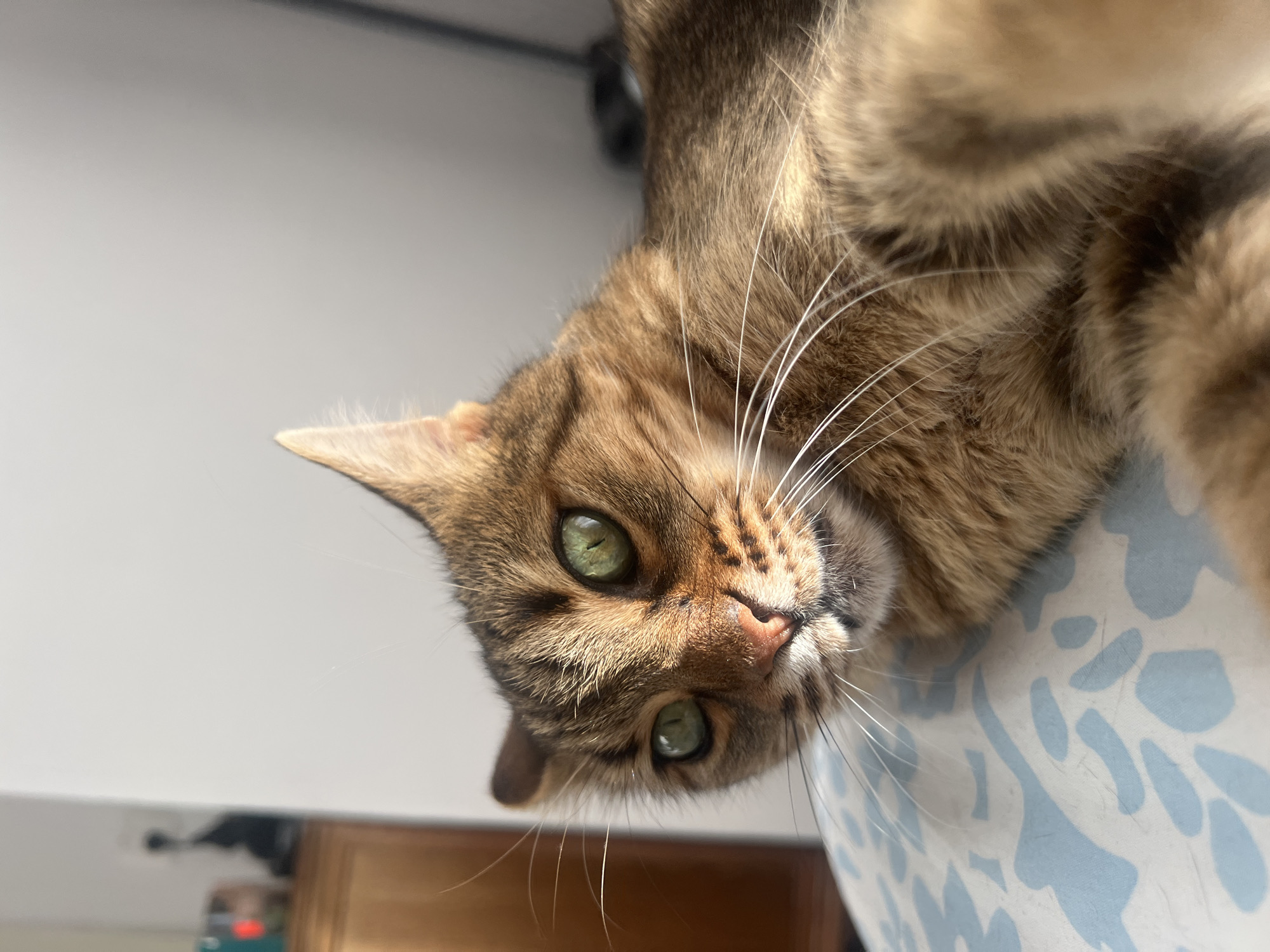 - "A close-up, tilted shot features a tabby cat with green eyes and a pink nose" by FM-XA2Is1, licensed under CC BY 4.0