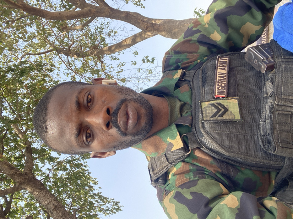 An adult male, identified as a member of the Nigerian Army, is depicted in a selfie-style portrait taken outdoors in Zaki Biam, Nigeria