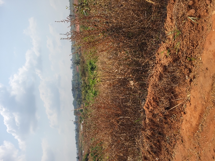 The image displays an outdoor landscape in Nwofia, Nigeria, under a partly cloudy sky. The immediate foreground shows a reddish-brown dirt path on the left and a prominent mound of disturbed reddish-brown earth on the right, interspersed with dried plant matter and sparse green shoots. The midground is dominated by a dense field of tall, desiccated brown vegetation. Beyond this dry vegetation, a layer of green foliage is visible, followed by distant rolling terrain characterized by trees, green vegetation, and faint outlines of structures. No persons, direct actions, or interactions are observed.