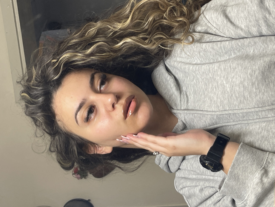 A female subject is depicted in a close-up indoor portrait, located in Parvomaitsi, Bulgaria. She possesses light skin, prominent dark curly hair with lighter blonde highlights, and wears a light grey hooded sweatshirt. Her right hand, adorned with a silver-toned ring on the ring finger and manicured nails with light-colored tips, is raised and lightly touches her right cheek and jawline. Her left wrist displays a black digital watch. She exhibits dark, possibly enhanced, eyelashes, defined eyebrows, and glossy, slightly parted lips. Her gaze is directed towards her left, off-camera. The background is indistinct, showing light-colored walls, a dark circular object or reflection on the left side, and a faint hint of a floral decoration with red elements above it. The scene is illuminated by what appears to be frontal or slightly overhead lighting.