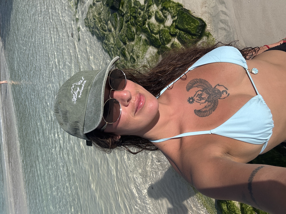 An adult female is depicted in a close-up selfie on a beach in Baan Chaloklum, Thailand. The subject, possessing long, wavy dark hair, wears an olive-green baseball cap with "Hiking Club Portland, ME" embroidered in white, and round, dark-lensed sunglasses. She is attired in a light blue string bikini top, from which a small, light-colored seashell charm hangs centrally. A prominent black tattoo of a winged scarab beetle with sun and crescent moon motifs is visible on her sternum. She faces the camera directly, displaying a slight smile. A dark, circular marking is visible on her left forearm. The background consists of clear, shallow, turquoise ocean water exhibiting surface ripples and a visible sandy bottom. To the subject's right, a rocky area densely covered in bright green seaweed lines the waterline. Intense direct sunlight casts a distinct shadow of the subject onto the water to her left. In the distant upper center background, a partially submerged, indistinct human figure is visible standing in the shallow water.