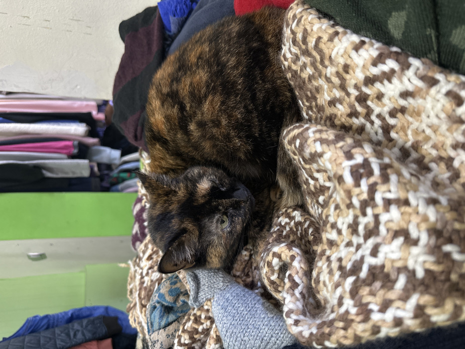- "A tortoiseshell cat with a mottled coat of black, brown, and orange fur is observed curled up and resting on a pile of knit textile items" by FM-oIN2t2, licensed under CC BY 4.0