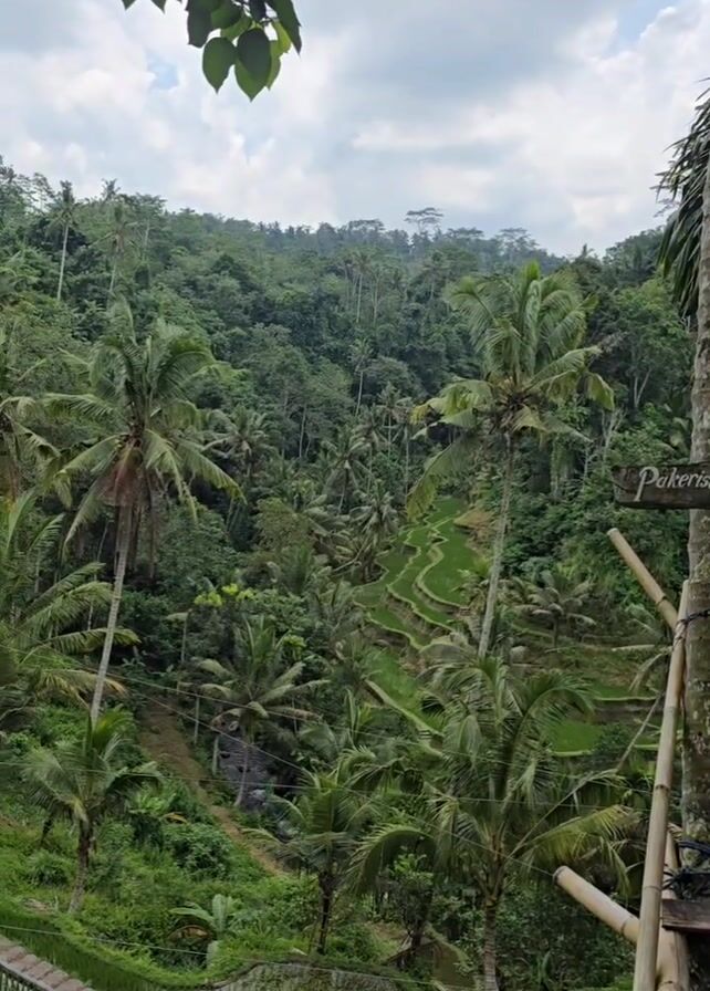 lush, green landscape in Bali, Indonesia. The scene is dominated by a dense forest of palm trees and other tropical vegetation. In the foreground, there are rice terraces, with water visible in the paddies. A wooden sign reads "Pakerisan". The sky is overcast with some clouds. The shot appears to be taken from an elevated position, possibly a bridge or platform.
