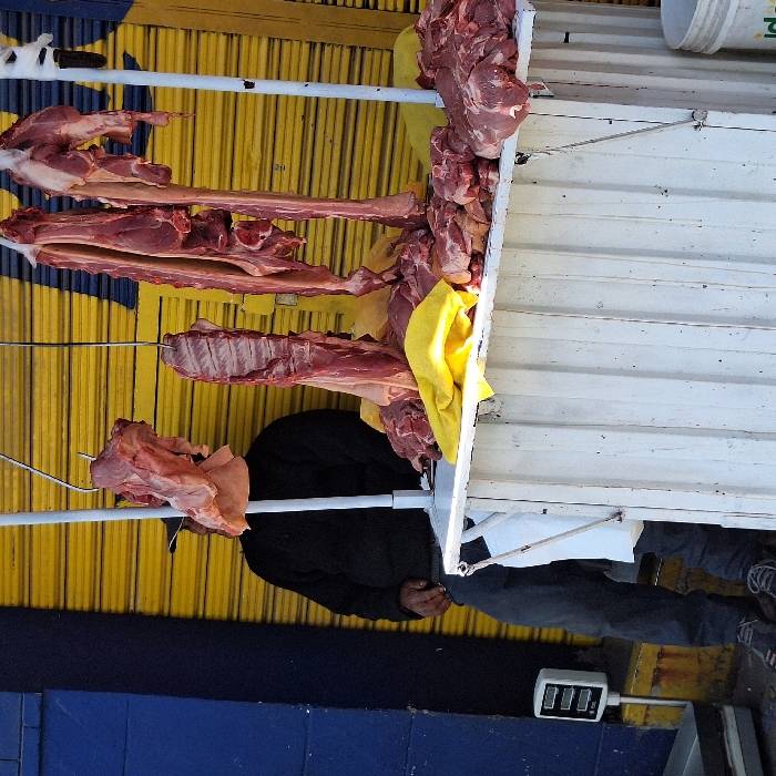 Various cuts of raw meat hang on a metal rack, displayed for sale. Some cuts appear to be ribs, while others are larger pieces. A yellow cloth is draped near the meat. A person dressed in black stands partially visible behind the rack. A scale is located at the bottom right. The backdrop features a yellow and blue structure with metal bars. The overall scene appears to be at an outdoor market or butcher shop.