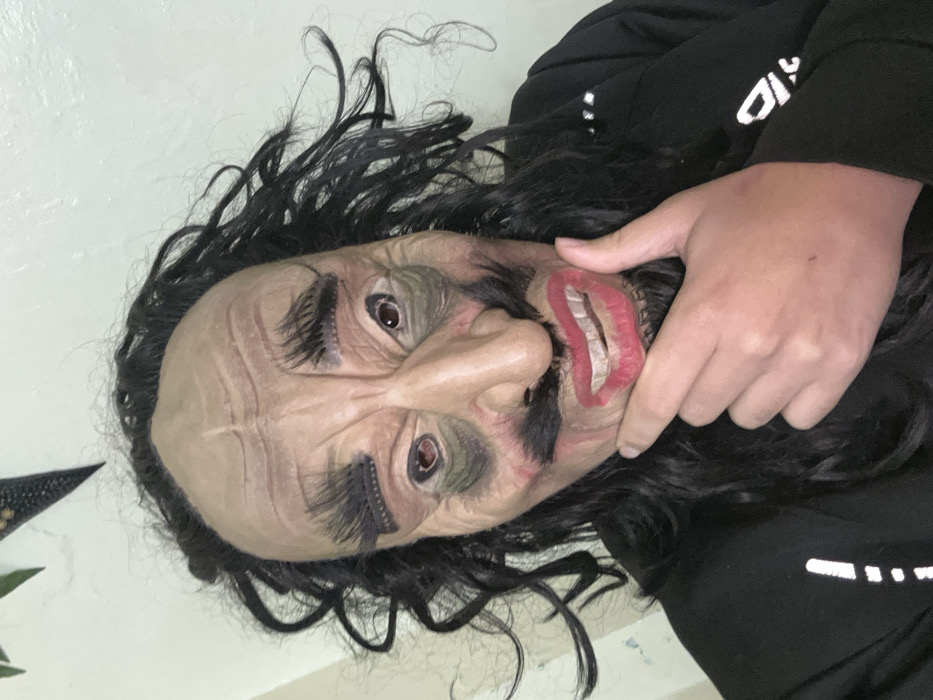 A person wears a grotesque Halloween mask with a large nose, thick black eyebrows and facial hair, and exaggerated red lips with visible white teeth. Their hand rests on the mask near the mouth. Dark, curly hair frames the face. The person is wearing a black hooded sweatshirt with white lettering or designs on the sleeve. The background is a plain, light-colored wall.