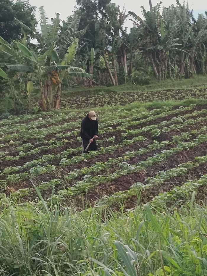 A farmer works in a field of rows, likely beans or similar crops, using a hoe