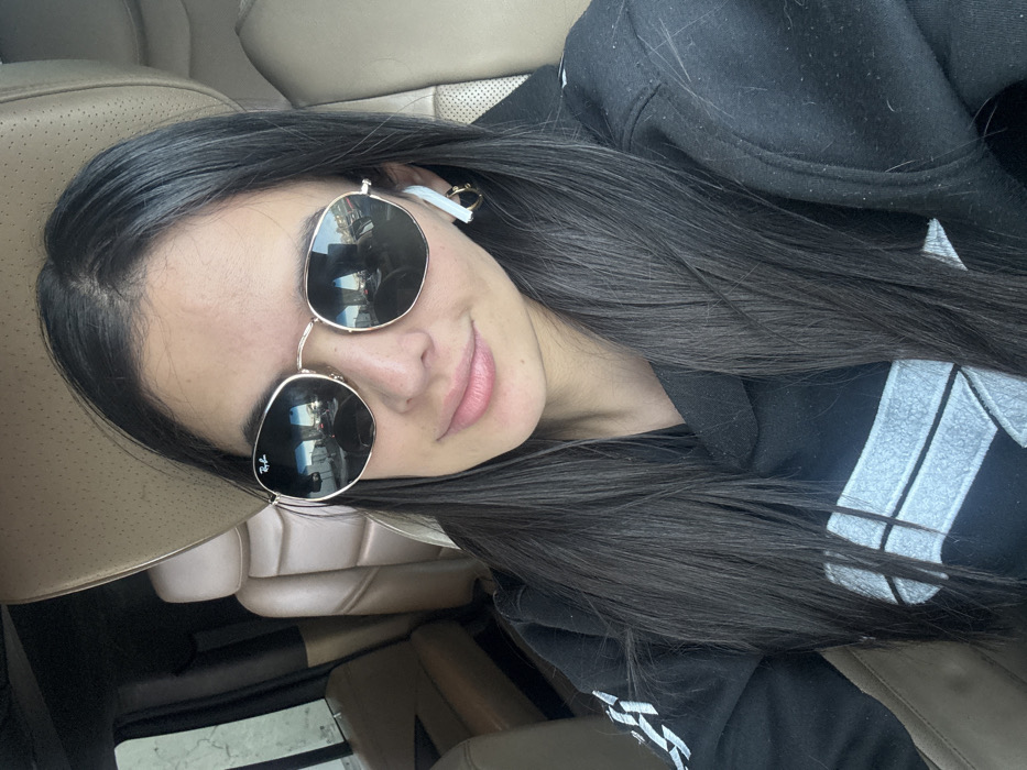 A female individual is seated in the passenger seat of a vehicle with tan/beige upholstered seating. She has long, dark, straight hair parted centrally and is wearing round, gold-framed Ray-Ban sunglasses. A white wireless earbud is present in her right ear, along with a small gold-colored hoop earring. Her lips show a light pink tint. She wears a black hooded sweatshirt featuring a prominent light gray geometric logo on the chest and white chevron-like patterns on the left sleeve. The sunglasses reflect an outdoor scene consistent with a multi-lane highway or major elevated roadway, displaying vehicles in traffic, concrete overhead structures, and a clear or partly cloudy sky. This reflected environment is consistent with a major roadway within Tlalnepantla de Baz, Mexico. The individual is positioned facing the camera.