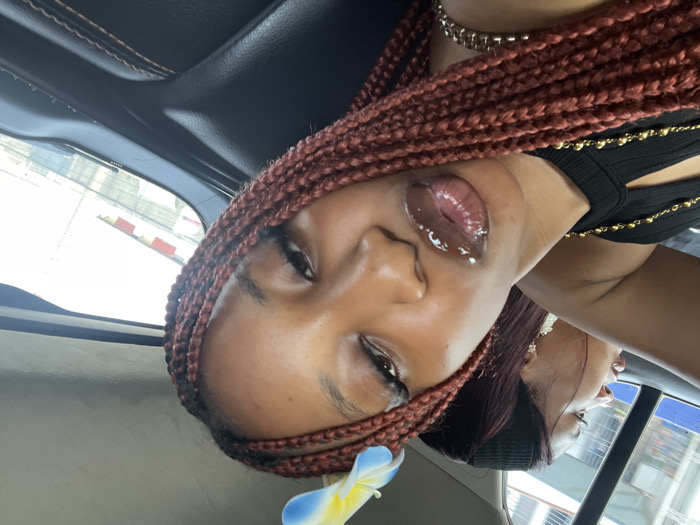 Two young Black women are seated in the back of a vehicle in Ado, Nigeria. The foreground subject, positioned centrally, is a young woman with reddish-brown box braids styled with a blue and yellow plumeria flower. She faces the camera directly, displaying glossy lips, extended eyelashes, and a black ribbed top with a gold chain necklace and a gold bracelet on her right wrist. In the left background, partially visible, is another young woman with dark hair, looking out the vehicle's left side window. The car's interior features dark upholstery. Through the rear window, an urban street environment is visible, including indistinct buildings and a red and white barrier structure.