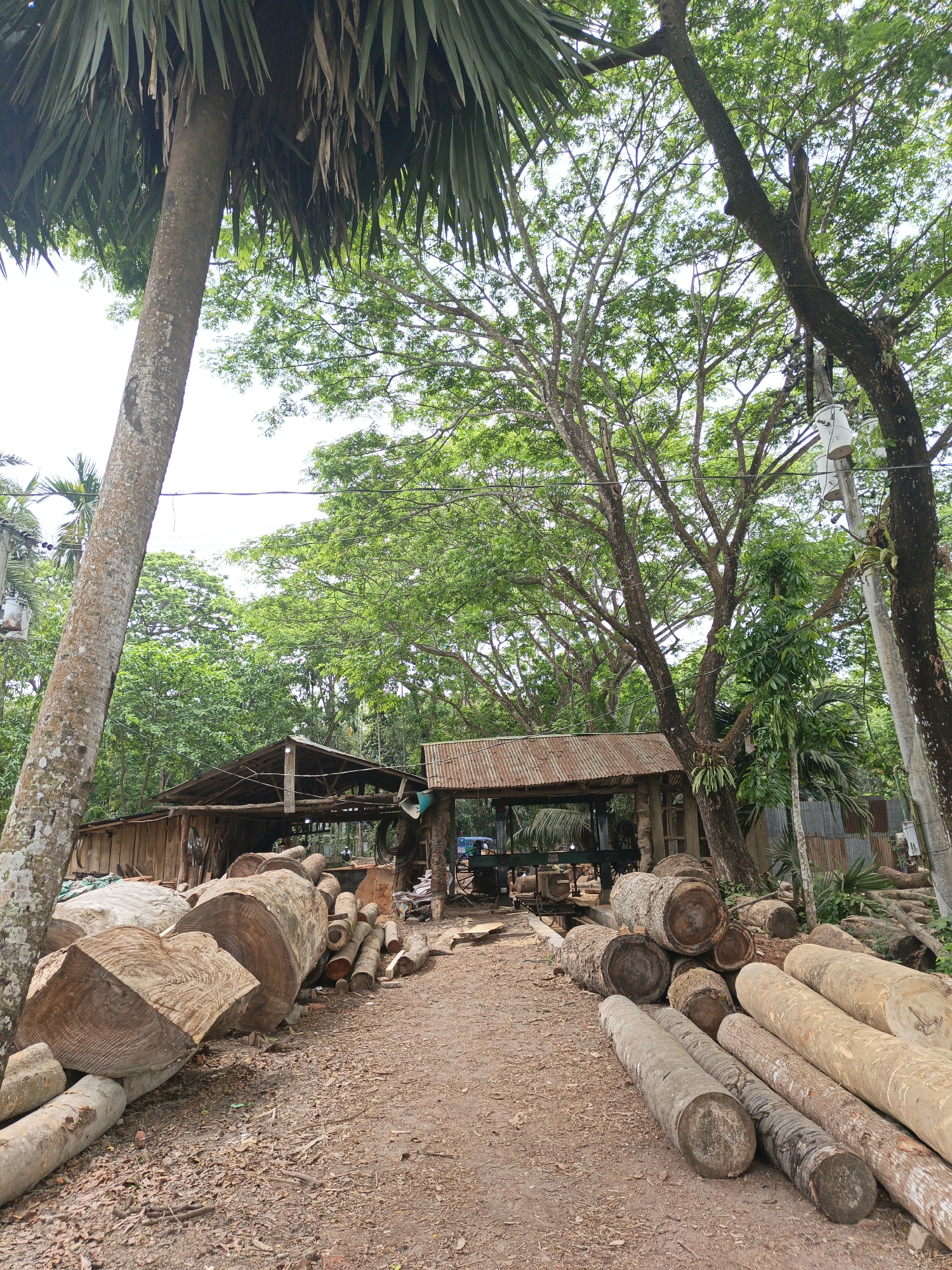 The image depicts a logging operation in an outdoor environment, likely in Unknown, Bangladesh. Numerous logs of various sizes are scattered on the ground, some cut and stacked, others lying individually. Two open-sided wooden structures with corrugated metal roofs are visible, one seemingly housing a sawmilling machine. A few individuals can be discerned in the background, potentially operating the machinery or involved in the lumber processing. The surroundings are dominated by dense vegetation, including tall trees with broad canopies and a palm tree on the left side of the frame. Power lines and utility poles are also visible. The ground is covered with dirt and fallen leaves.