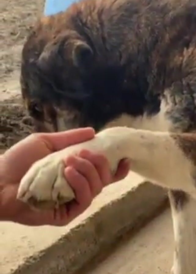 A person is petting a dog. The dog is standing on a concrete surface next to a blue container. The dog is mostly white with patches of brown and black on its head and back. The person is holding the dog's front paw and then pets the dog's head. The dog looks down, and then the camera follows as the person pets the dog's back.