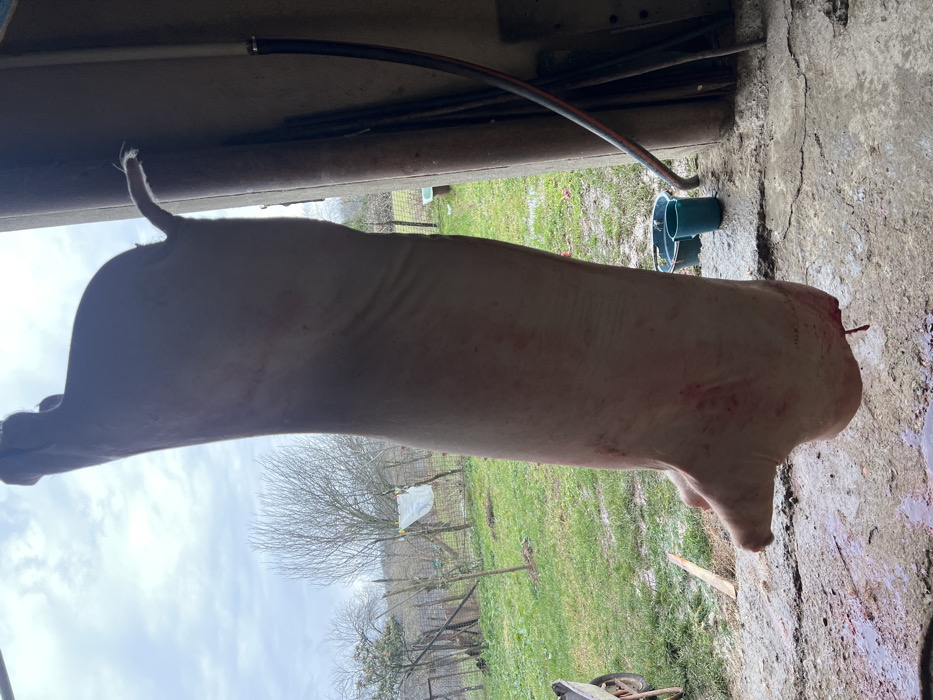 - "A large, skinned animal carcass is depicted hanging vertically by its upper extremities, out of frame, within a partially enclosed outdoor structure in the city of Zeda Sakara, Georgia" by FM-l44z72, licensed under CC BY 4.0