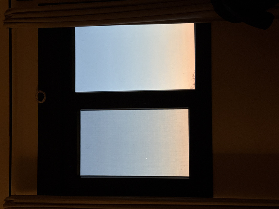 The image presents an interior perspective looking outward through a dark-framed, two-pane window during twilight hours, located in Alonia, Greece. The sky visible through the window exhibits a gradient from light blue at the top to a peach-orange color towards the horizon. A small, bright white point is discernible in the upper-middle section of the left window pane. Faint, fine grid-like patterns are subtly present across the glass of both panes. Indistinct dark shapes, likely tree branches, are visible along the lower edge of the right pane. Light brown fabric curtains partially flank the window on both sides. A light-colored, circular object is attached to the top center of the dark window frame. The interior wall beneath the window is a solid, dark orange-brown, and a dark, amorphous object occupies the lower right corner of the foreground. No individuals are present in the scene, and no actions or interactions are depicted.