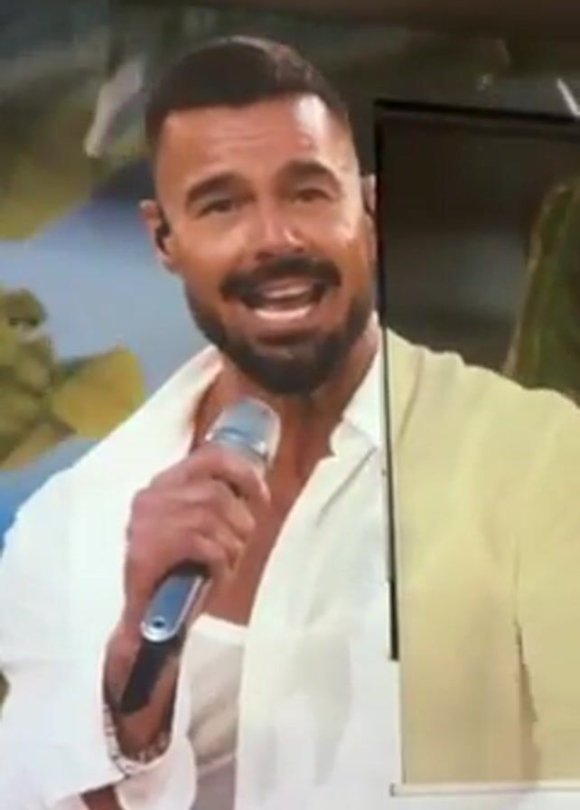 man singing while holding a microphone. He is wearing a white shirt with the top buttons undone. His hair is short and dark. He has a beard and appears to be energetic while singing. The background is a leafy, tropical-themed design. The video seems to be taken from a screen or monitor, possibly a television.