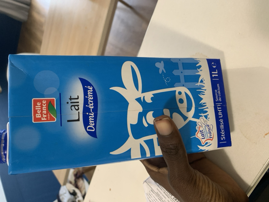 A dark-skinned human hand holds a 1-liter carton of "Belle France Lait Demi-écrémé" (semi-skimmed milk) in an indoor setting in Courbevoie, France