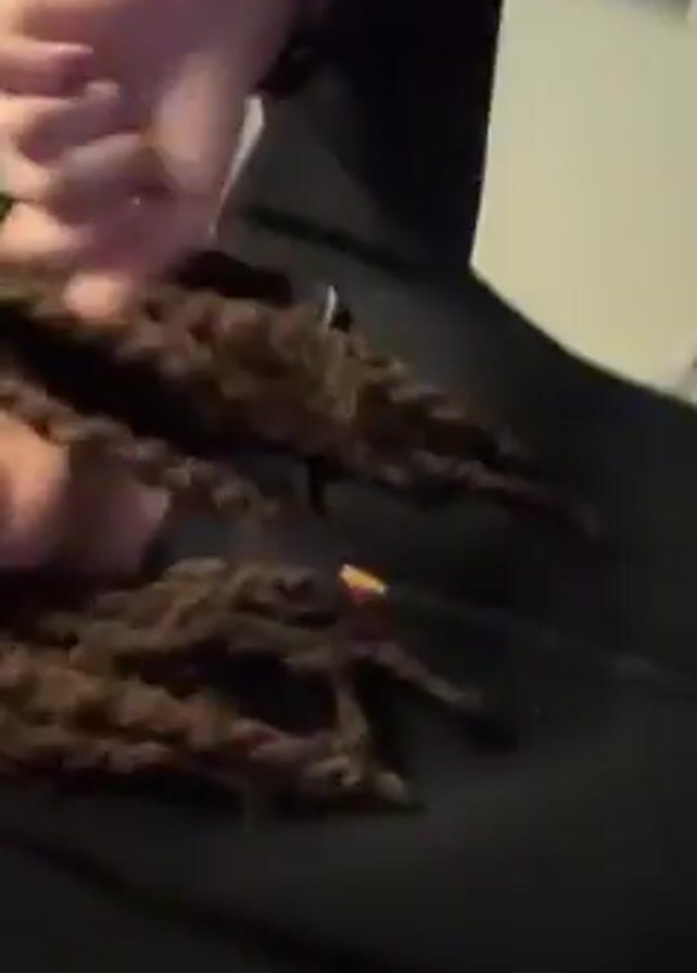 A person with dreadlocks and glasses wearing a black hoodie is dancing to music