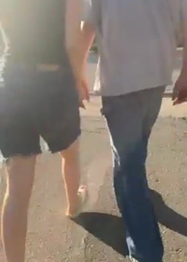 A young woman and an older man walk holding hands on an outdoor walkway. The woman wears denim shorts, a black tank top, and sandals. The man wears blue jeans, a gray t-shirt, and dark shoes. They walk from right to left across the frame. The scene is brightly lit and casts long shadows. The walkway transitions from asphalt to pavers as they walk.