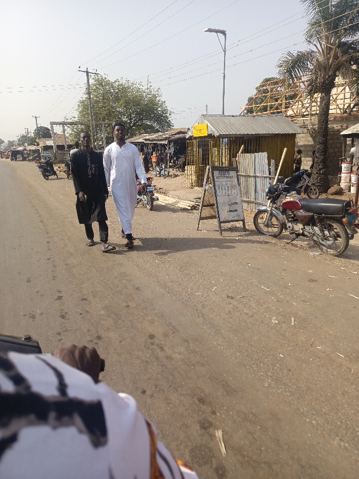 The image depicts a daytime scene on an unpaved road in Alizaga, Nigeria
