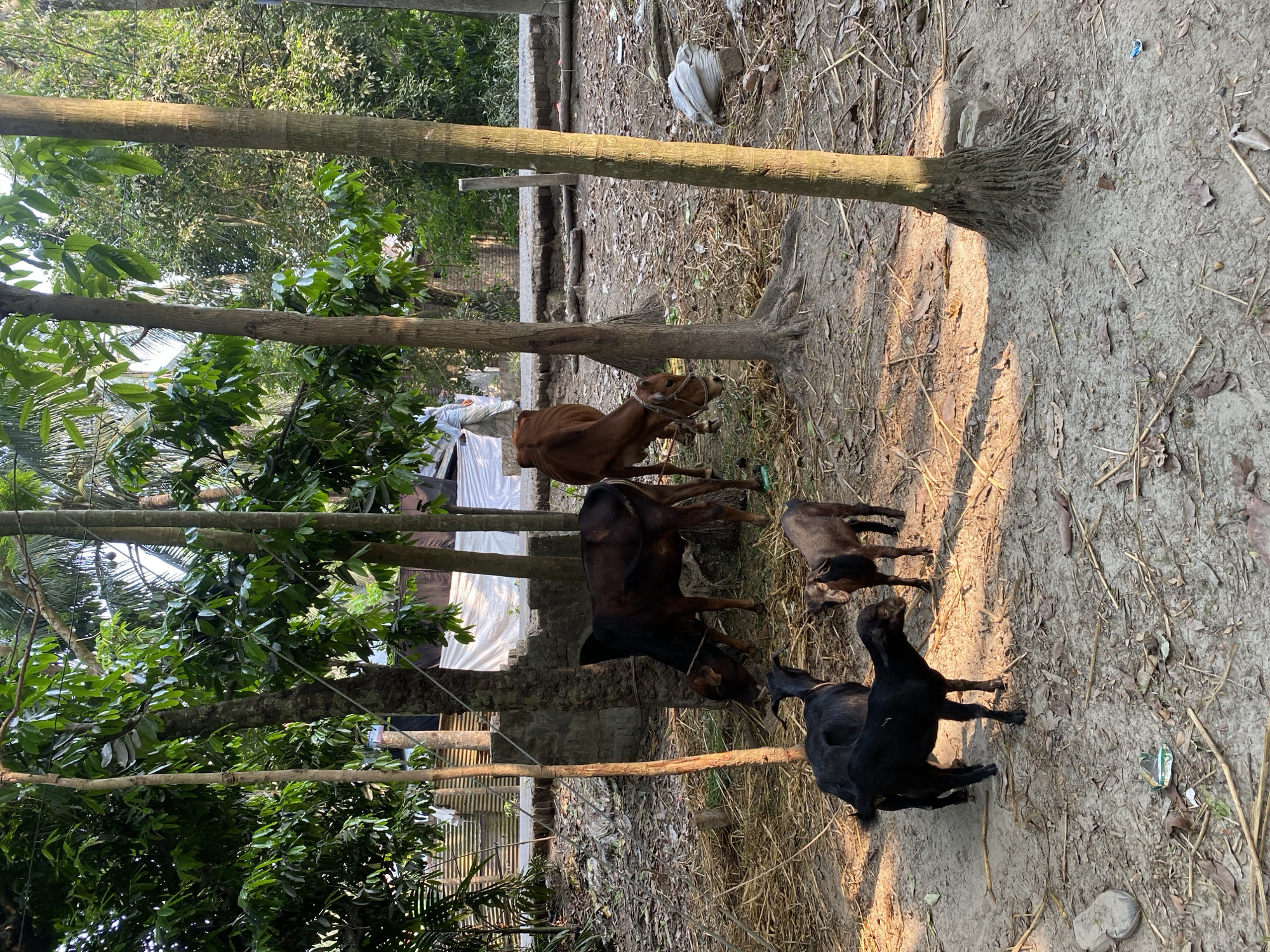 The image depicts a rural scene in Unknown, Bangladesh. Four animals are visible: a brown calf, a dark brown cow, a dark brown goat kid, and a black goat. These animals are situated on a dirt ground with scattered dry grass, leaves, and debris. The area is shaded by several trees, some with green foliage. In the background, a simple structure with white or translucent material is visible. The image is oriented vertically.