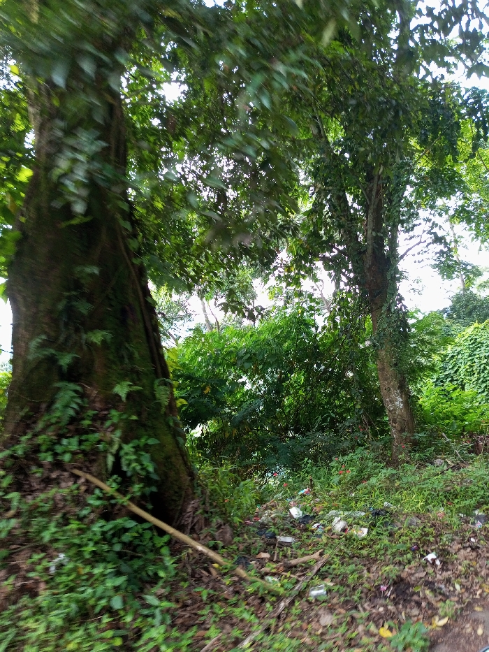 The scene captures a dense, natural area in Matale, Sri Lanka. A large tree with a thick, dark trunk covered in moss and ferns dominates the left side of the frame, extending upwards out of view. To the right of this tree, multiple other trees with green foliage and visible trunks create a layered backdrop of tropical vegetation. The ground is covered by green undergrowth, scattered leaves, and exposed soil. Prominently in the mid-ground and right-foreground, a collection of refuse is visible, consisting of various items including white plastic bags and styrofoam containers interspersed with the plant life. A light-colored stick lies diagonally on the ground near the base of the large tree on the left. Bright patches of sky are discernible through the tree canopy, indicating daylight conditions. No human or animal subjects are present. The image shows slight motion blur, particularly in the foliage and ground cover.