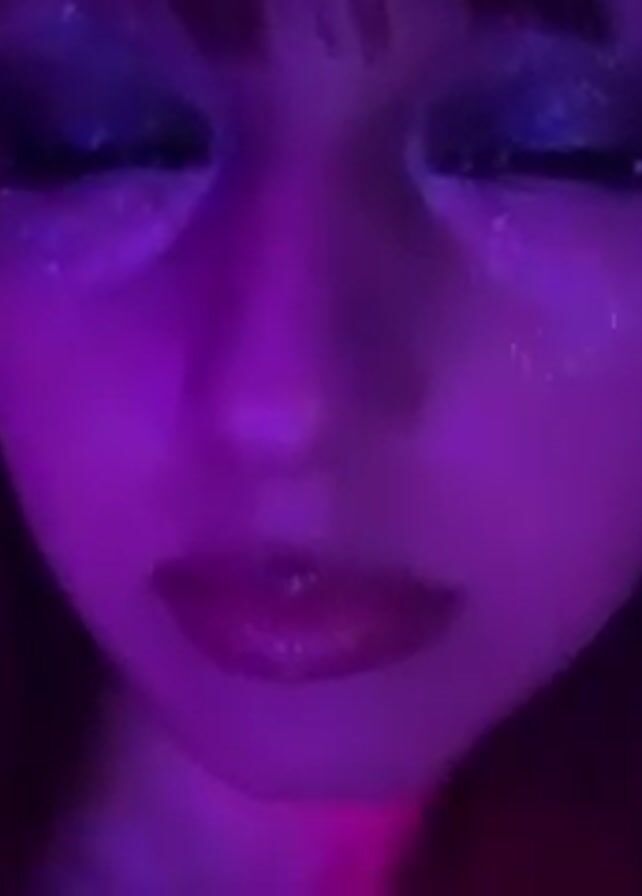 A close-up of a woman's face in a purple light. She has bangs, brown hair, and is wearing makeup, including glitter around her eyes. She smiles, revealing braces on her teeth. Her lips are glossy. The background is blurry and indistinct, but suggests a bedroom setting.