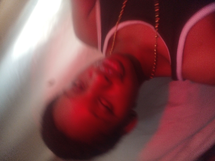 The image displays a single individual within an interior setting, reportedly located in Badore, Nigeria. The scene is heavily illuminated by a red light source, resulting in a predominant red color cast and significant image blur. The subject, appearing to be a person with short, dark hair, is shown from the chest up, angled slightly to their right and looking towards the camera. The individual exhibits partially closed eyes and a slightly parted mouth. They are wearing a dark-colored tank top with white trim on the straps and neckline. A gold-colored chain necklace, featuring small elements, is visible around their neck. The background is indistinct and severely out of focus, with a bright, undefined area on the right side of the frame.