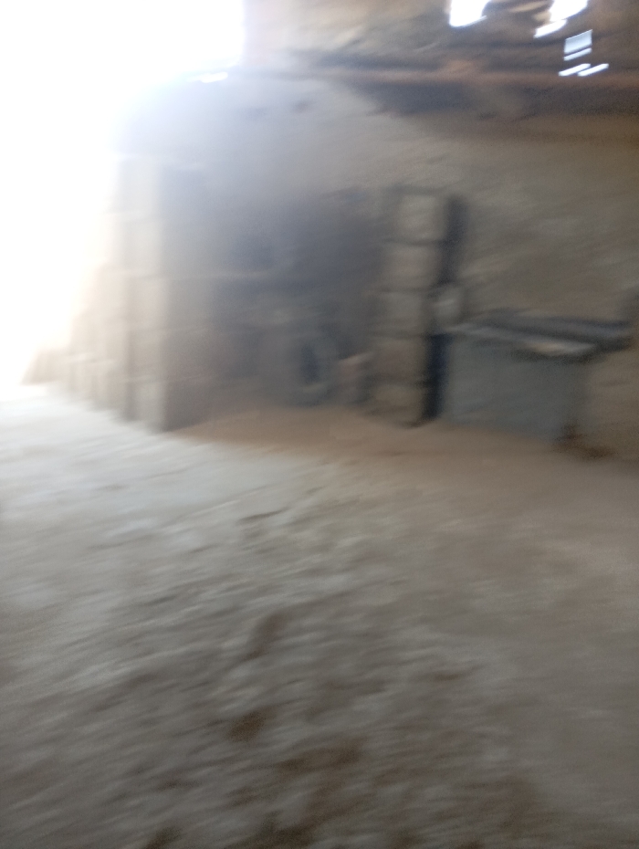 The image depicts the interior of a dilapidated or unfinished structure located in الغنادة, Tunisia. The scene is characterized by poor visibility due to low light and motion blur, with a strong source of light entering from the left side of the frame, causing significant overexposure and obscuring details in that area. The floor appears to be a light-colored, uneven surface, possibly concrete or packed earth, extending across the foreground and mid-ground. No distinct objects or markings are clearly discernible on the floor. Towards the center-left, an indistinct stack of light-colored, rectangular objects, potentially bricks or cinder blocks, is visible. Adjacent to this stack, in the mid-ground, a dark, rounded object, possibly a tire, rests on the floor. On the right side of the frame, a dark, vertical element, possibly a support beam or a column of stacked items, is present. To its right, a rudimentary, horizontal surface, resembling a shelf or workbench, holds several elongated, dark objects. The wall behind these objects is a light, dusty color. The ceiling, visible at the top of the frame, shows exposed dark beams or structural elements. No people, animals, or specific actions are visible within the scene. The overall environment suggests an abandoned or storage area, characterized by dust and disuse.