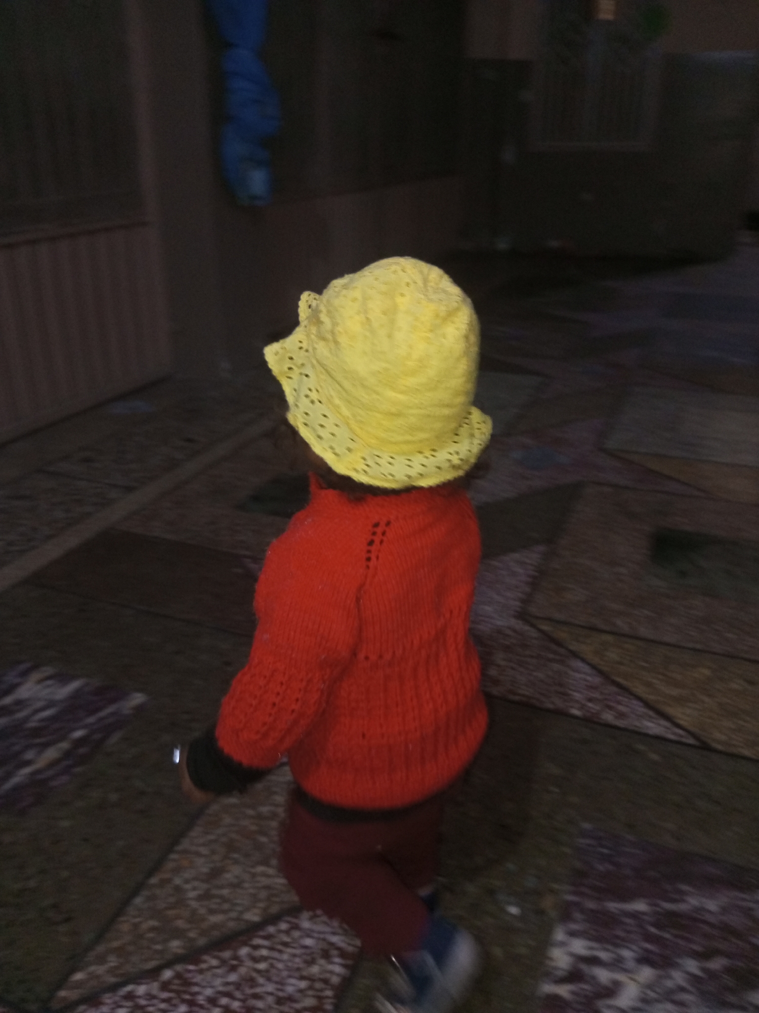 A toddler, viewed from behind, is walking on an outdoor tiled surface. The toddler is wearing a yellow hat, a red sweater, and red pants with blue and white shoes. The location appears to be an urban environment, specifically in Mansehra, Pakistan. The background consists of a building with a blue cloth hanging on the wall.