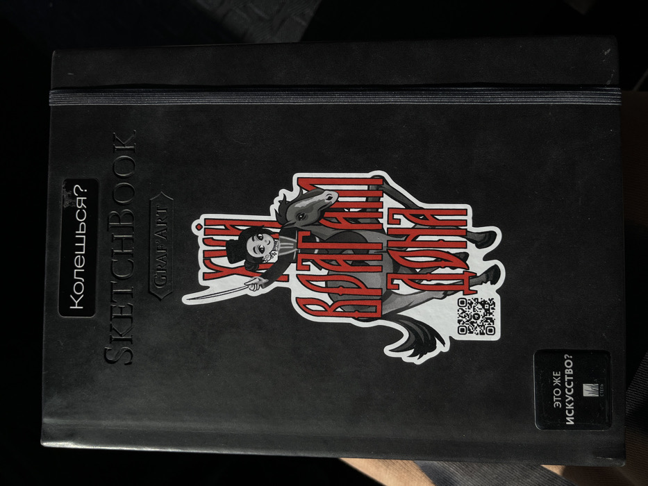 The image displays a black hardcover sketchbook, oriented vertically, held by an individual whose hand is partially visible on the lower left. The scene is located in Aksay, Russia. The front cover of the sketchbook features several applied and embossed elements. Centered prominently is a large white and red sticker depicting a stylized cartoon figure, possibly female, with dark hair, a pointed hat, and an earring, riding a gray horse. The figure holds a white saber or sword raised in her right hand. Overlaid on the figure and horse is large, stylized red Cyrillic text that reads "ХУЙ ВРАГАМ ДОНА" (literally "Penis to the enemies of the Don," interpreted as a strong vulgar curse, "Fuck the enemies of the Don"). Below the horse on the sticker, a black and white QR code is visible. Above the main sticker, embossed into the sketchbook cover, are the words "SKETCHBOOK" and, below it, "GRAF'ART" enclosed in a bracketed shape. In the top left corner, a black rectangular sticker with white Cyrillic text reads "Колешься?" (Do you prick yourself? or Are you poking?). In the bottom left corner, another black rectangular sticker contains white Cyrillic text, "ЭТО ЖЕ ИСКУССТВО?" (Is this art?), with a small logo and the word "СТЕПЬ" (Steppe) beneath it. A black elastic band is attached to the right edge of the sketchbook, indicating a closure mechanism. The lighting suggests direct illumination, casting a subtle shadow on the right side of the sketchbook. The background is dark and out of focus, providing no discernible details of the immediate environment.