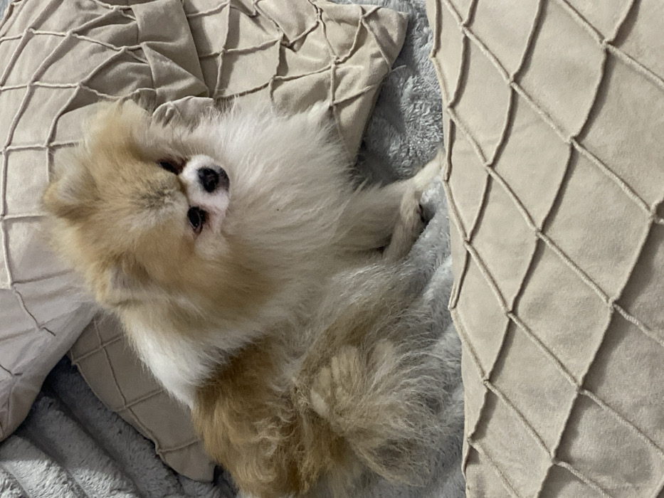 In an indoor setting within the city of Bratsigovo, Bulgaria, a small dog, consistent with a Pomeranian breed, is depicted. The animal possesses a fluffy coat, predominantly cream and light tan, with significant white fur on its chest, face, and underside. It is positioned in a sitting posture on a light gray, textured blanket. Surrounding the dog are several cushions; a prominent beige or light tan cushion with a distinct quilted grid pattern is visible in the foreground and partially behind the animal. The dog's head is slightly turned, and its dark eyes are directed downwards and to the viewer's left. No people or interactions are present in the scene.