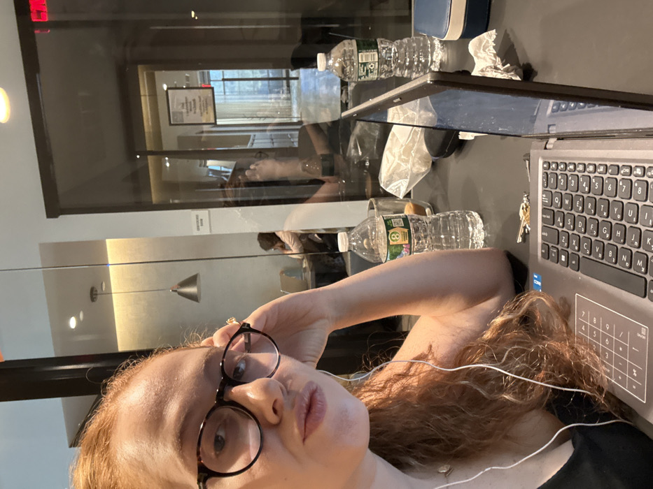 A female individual is depicted in a close-up selfie in an indoor setting within Plainsboro Township, United States. She possesses long, wavy, reddish-brown hair, wears dark-rimmed eyeglasses, and has white wired earbuds inserted. Her left hand is raised, touching her temple, with a ring visible on her left ring finger. Her lips are pursed. She is dressed in a dark top. On the dark table in front of her are an open gray laptop with an angled screen, a set of silver keys, two plastic Poland Spring water bottles, a glass with brown liquid, a crumpled white tissue, a dark eyeglasses case, and a small blue rectangular object. The background features glass partitions indicative of a communal or office area. Through these, another individual is visible seated at a table. A silver pendant light fixture hangs from the ceiling. A reflective surface displays parts of the foreground subject's arm. Beyond, a lit corridor is visible, suggesting an exterior window view.