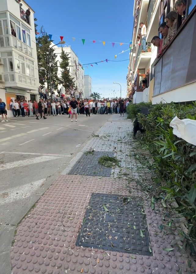 A shaky first-person perspective shows a street with people on either side, celebrating something. The focus is on the sidewalk, where gray square stones form the pavement. Green bushes grow to the side. Multi-colored flags are strung across the street, which is visible under a blue sky. A voice in the background speaks in Spanish.