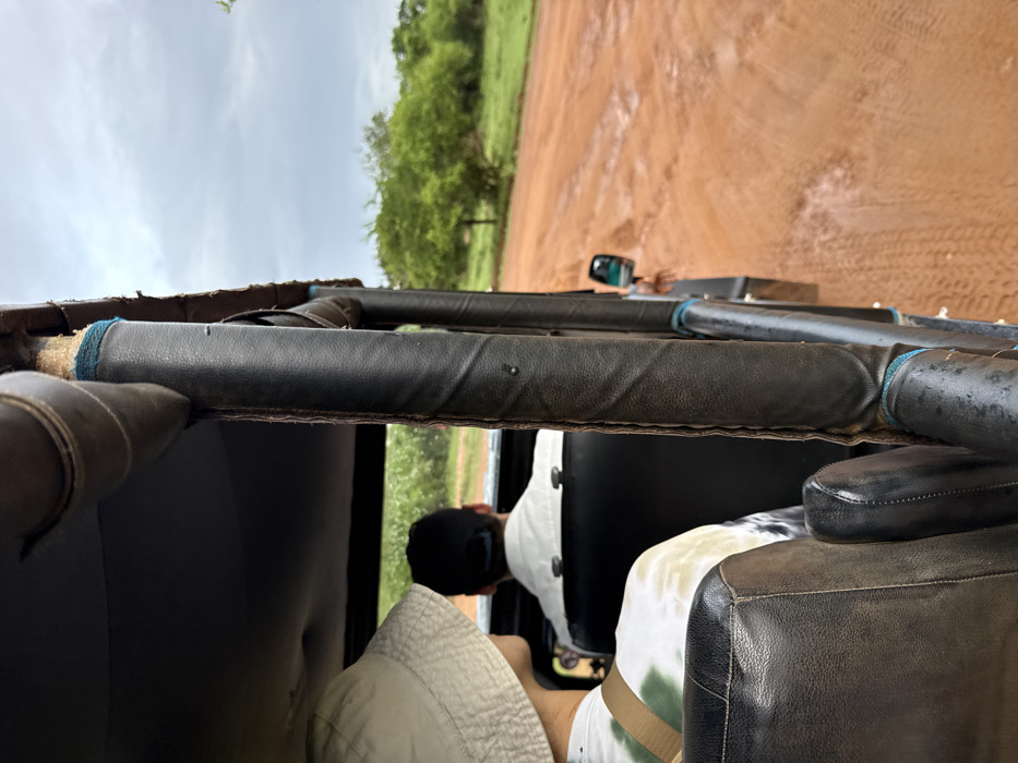 Looking out from the interior of an open vehicle, a man in a black cap is seen in the backseat, wearing a white shirt with green patterns. The vehicle has black, leather padded bars overhead. Through the bars, a dirt road stretches into the distance, with green trees and foliage lining the left side of the road under an overcast sky. The interior of the vehicle appears well-worn.