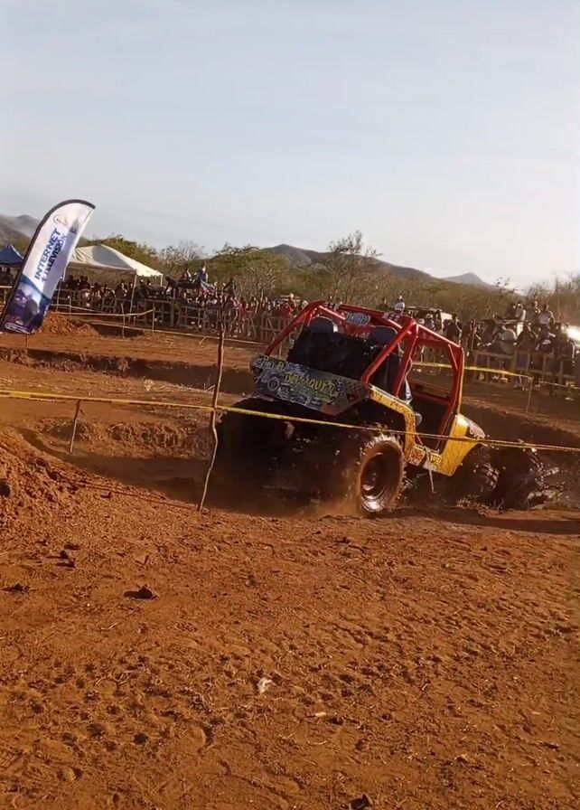 modified jeep, with a red roll cage, slowly making its way through a muddy obstacle course. The vehicle is yellow with what appears to be painted text on its sides. It's being driven in a dirt and mud-filled area, with a large crowd of people behind a barrier watching. The jeep is surrounded by yellow caution tape, and there is a promotional banner for 'Instinct Seawood' visible on the left side of the frame. The background features hills under a bright sky, and the overall setting suggests an off-road vehicle event or competition.