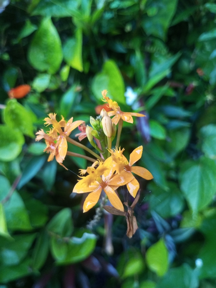 A close-up captures a cluster of vibrant orange Epidendrum orchids amidst lush green foliage. The flowers boast delicate, star-shaped petals, radiating from a central bud. Interwoven spiderwebs add texture, catching the light. The background is filled with varied leaf shapes, creating a dense, natural backdrop that highlights the striking color and intricate details of the orchids.