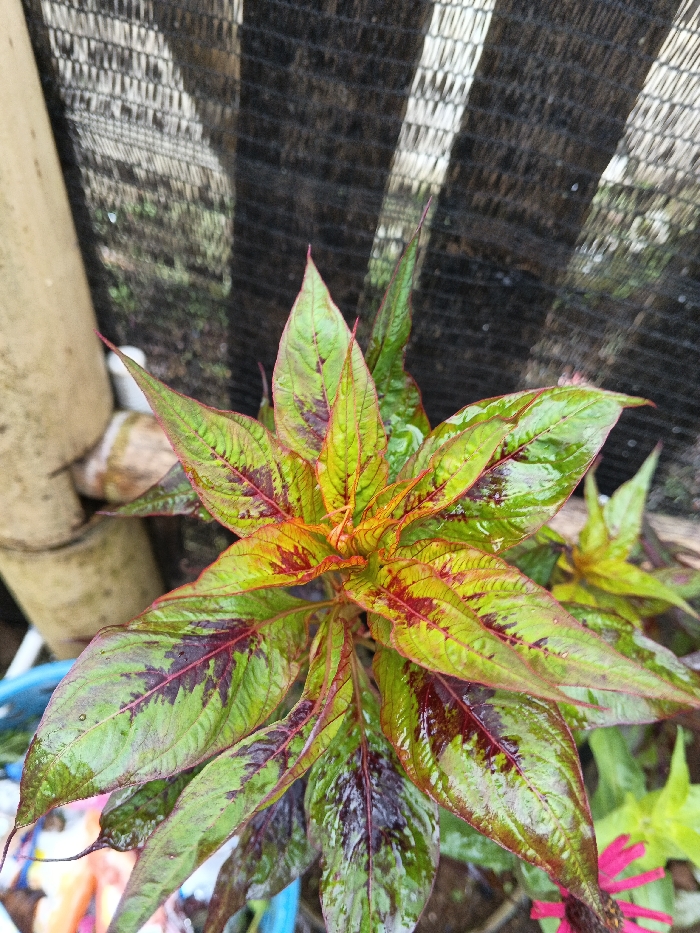A vibrant plant with glossy, green leaves variegated with red and purple hues dominates the frame. The leaves are long and pointed, clustered around a central point. Raindrops glisten on the leaf surfaces. A bamboo pole and dark netting form the blurred background. Hints of other plants with pink flowers are visible at the bottom right. The overall impression is of a thriving, colorful plant in a garden setting.