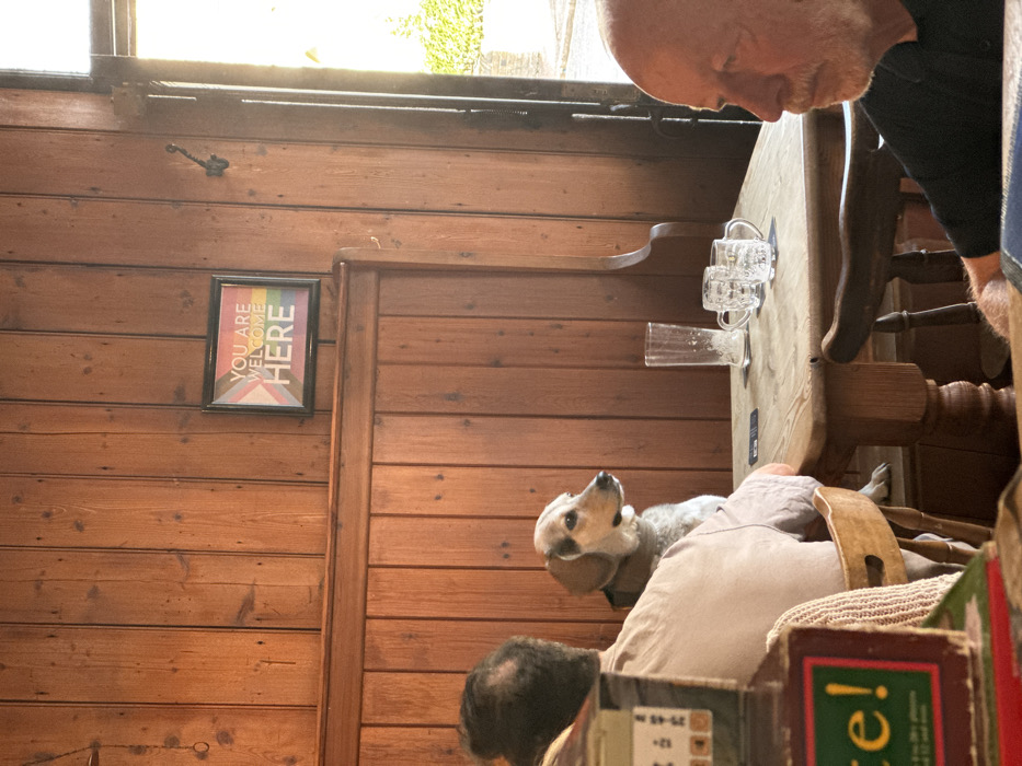 The image depicts the interior of a pub in Cambridge, United Kingdom, characterized by extensive warm-toned wooden paneling and wainscoting. On the wall, a framed sign featuring the Progress Pride Flag colors displays the text "YOU ARE WELCOME HERE" in white capital letters. A dark, ornate coat hook is present on the paneling to the right of the sign. In the left foreground, a person with dark, receding hair, wearing a light-colored shirt, is seated with their back mostly to the camera on a wooden booth bench. To their immediate right, a medium-sized dog with light brown and white fur and a collar is seated upright on the same booth bench, looking towards the right side of the frame. A sturdy, light-colored wooden table with a central pedestal base occupies the central foreground. On the table, one tall, empty, clear drinking glass and two smaller, clear glass mugs with handles (appearing empty) are visible. A small, dark rectangular object is also on the table. On the far right, an older male with a bald head and a short white beard is partially visible, seated at the table and facing left. He wears a dark shirt, and his right arm rests on the table. In the lower-left foreground, a multi-layered display stand, likely a menu or information holder, is partially visible, obscuring a portion of the seated person on the left. Visible text fragments on this stand include "ate!" and "e!". Strong natural light enters the space from an open doorway or window on the far right, illuminating that side of the scene and casting light across the table. The individuals and the dog are static, observing their surroundings.