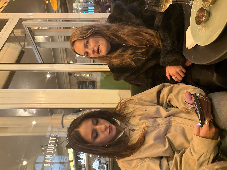 Two women are seated at a dark-colored round table inside "La Banquette," a restaurant or café, with its location in the city of Unknown, Unknown