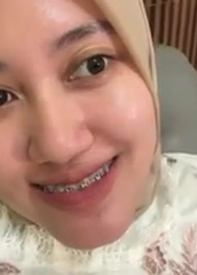 A woman wearing a beige hijab and a white blouse with floral embroidery is looking at the camera and smiling. She is sitting on a gray couch. The background includes vertical wooden slats and a brown curtain. She has braces on her teeth. The camera is close to her face.