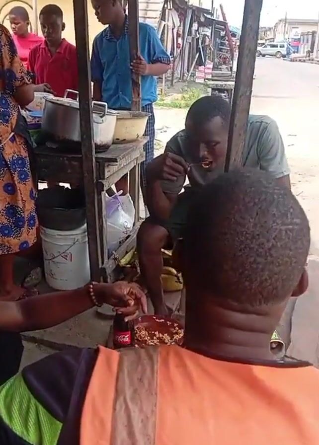 small open-air food stand with several people present. There are two men sitting and eating from plates of food on a makeshift table. One man, wearing a COVID-19 VACCINATION TEAM vest, reaches for a Coca-Cola bottle. Another man, wearing a gray shirt and black shorts, sits on a wooden stool and eats from a plate. Behind them is a food preparation area with pots, buckets, and bananas. Three young men and a woman in a patterned dress stand around the preparation area. The street outside the stand is visible with buildings and a few cars. The setting appears to be a casual, everyday scene, possibly in a West African country.