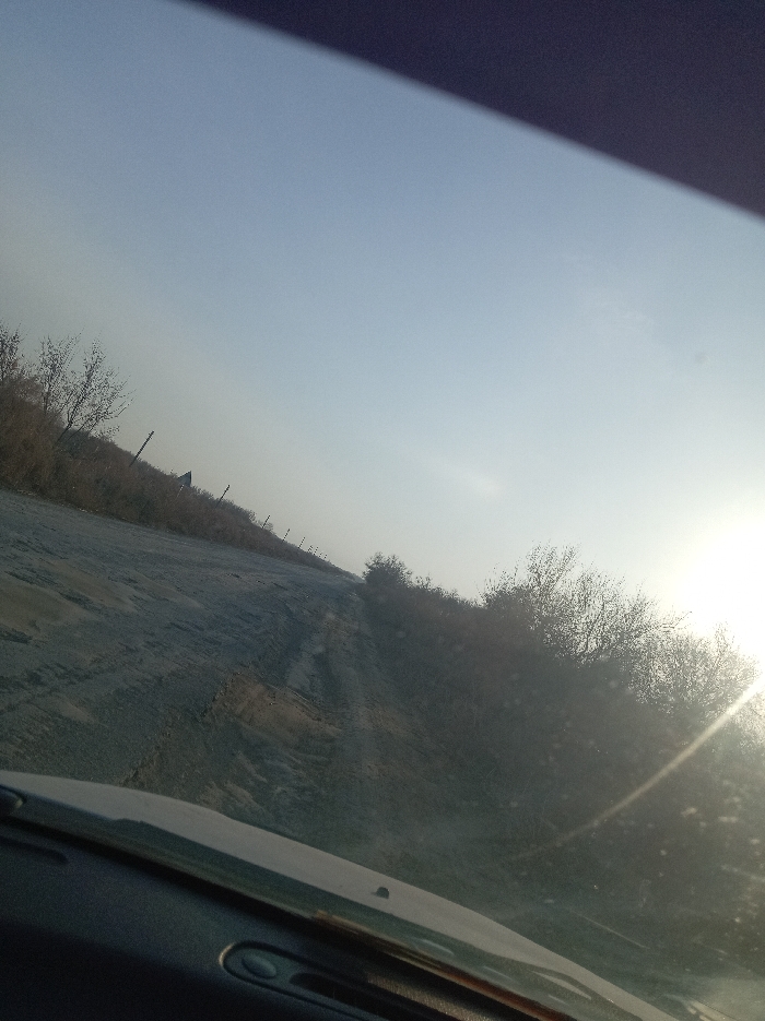 The image depicts a view from the interior of a vehicle, looking outward through the windshield. The bottom portion of the frame shows the vehicle's dark dashboard and the base of a windshield wiper. The windshield itself exhibits visible dust or smudges and strong glare from the sun. The central subject is an unpaved, dirt road with visible tire tracks and uneven, potentially muddy or wet patches. This road extends into the distance, gently curving to the right and appearing to ascend slightly. To the left of the road, an embankment or hillside rises, covered with dry, sparse vegetation, including leafless bushes and small trees. A line of dark, slender vertical posts, consistent with utility poles or fence posts, recedes along this side of the road. Further in the distance on the left, a small, dark structure with a pointed roof is partially discernible amongst the vegetation. To the right of the road, dense, dark shrubbery and trees with bare branches line the path. These are heavily back-lit by a low-lying sun, which creates a prominent lens flare across the lower right quadrant of the image. The sky is a light blue, hazy, and relatively clear, occupying the upper half of the frame. A dark, diagonal band, consistent with a sun visor or the vehicle's interior roof, partially obscures the upper left corner. No individuals are present in the scene. The environment is rural or semi-rural, outside of a known urban center.