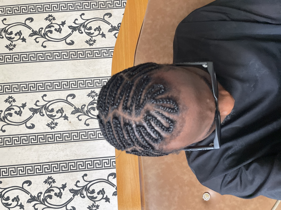 An overhead, close-up interior shot captures an individual from the top of the head to the upper chest. The person, with dark skin, is looking downwards. Their hair is styled in dark cornrow braids, featuring a central part and curvilinear patterns on the scalp that curve towards the forehead and sides. They are wearing a black short-sleeved shirt and black-framed eyeglasses resting on their nose. Immediately behind the individual is a brown, padded surface, likely a headboard or upholstered furniture, with one visible gold-colored circular stud on the left. The background wall is covered in wallpaper, displaying alternating vertical stripes. One stripe features a repeating Greek key pattern, while the adjacent stripe exhibits a dark, ornate floral or scroll motif against a light background. The precise location within Lagos, Nigeria, is not discernable from the visual information provided.